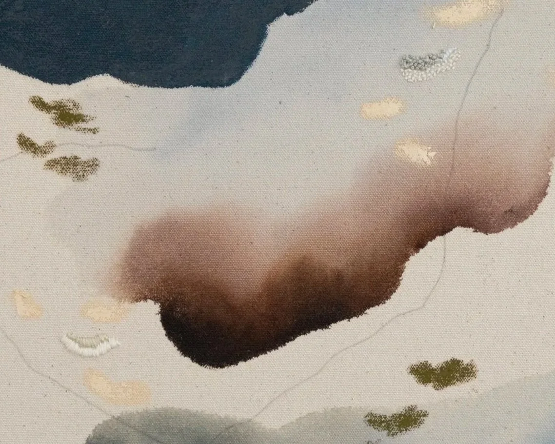 Acrylic paint, oil-based pigment sticks, graphite, charcoal, and fine embroidery threads in silk and cotton.