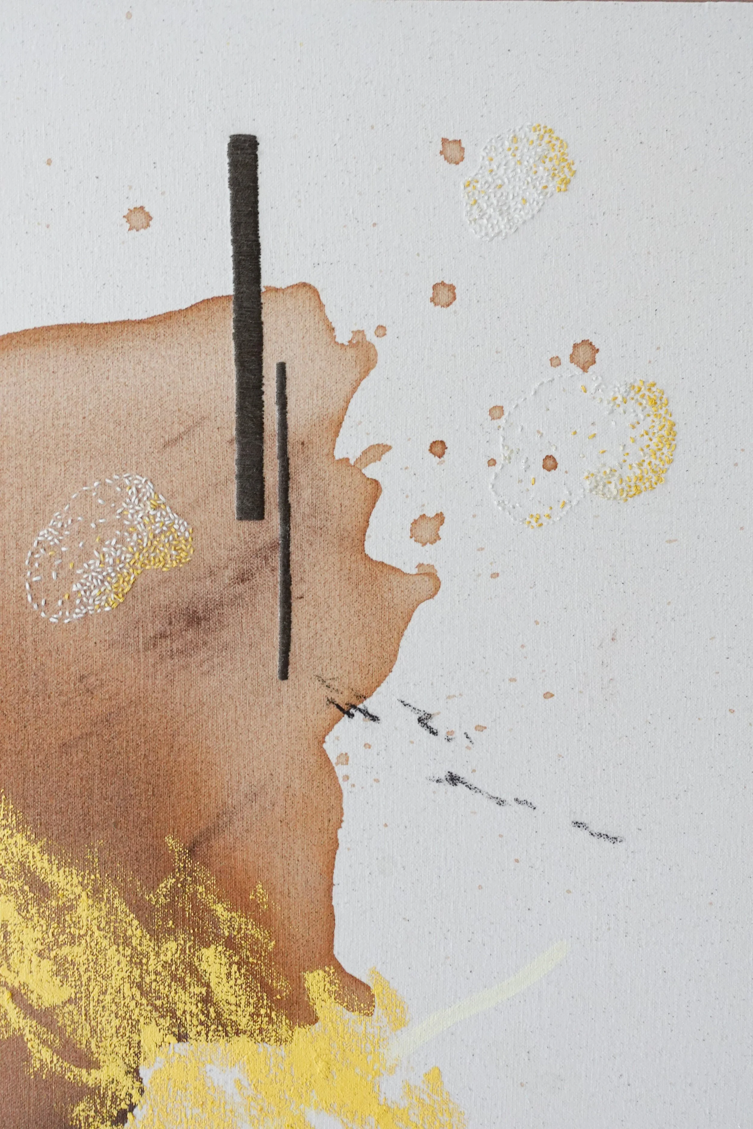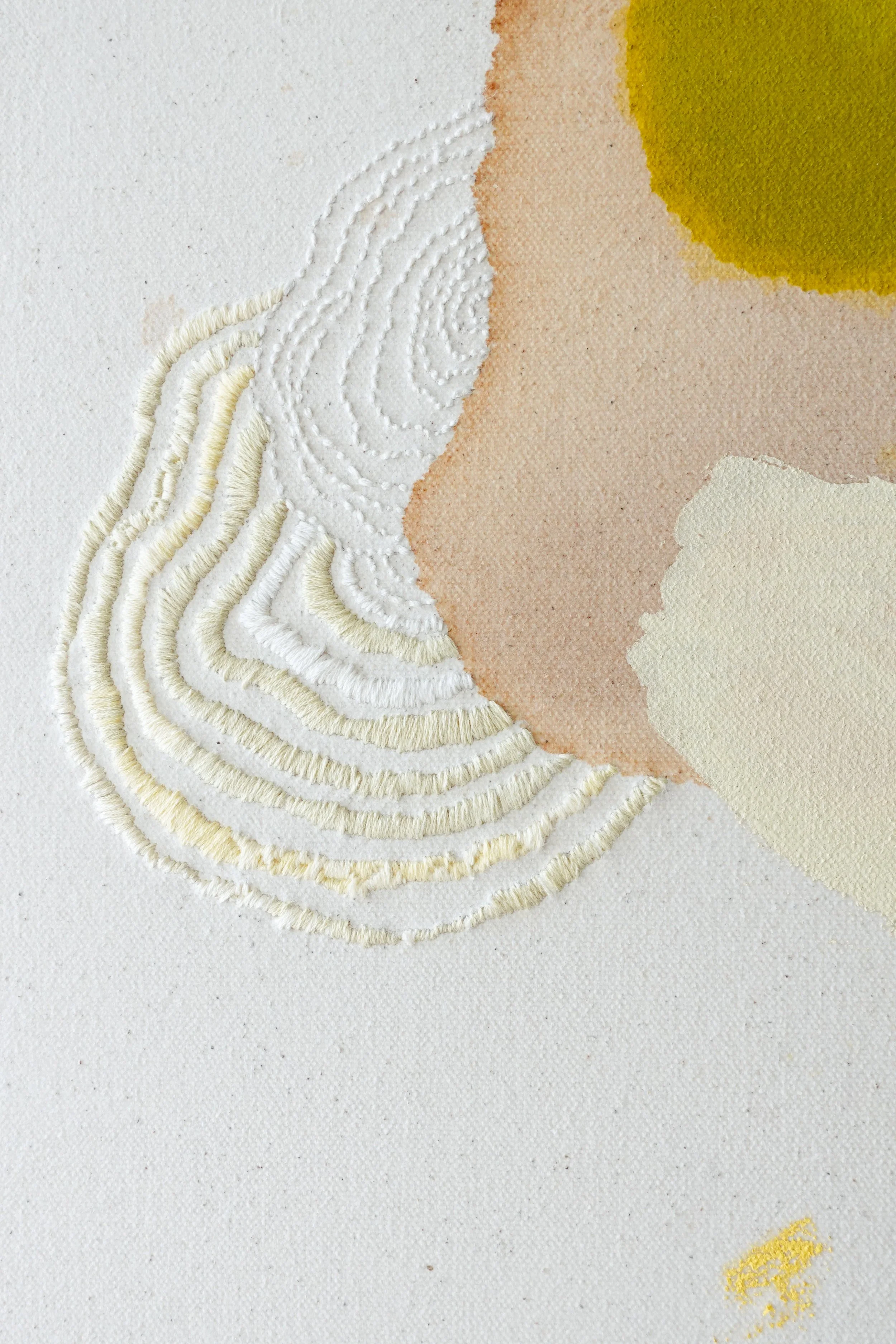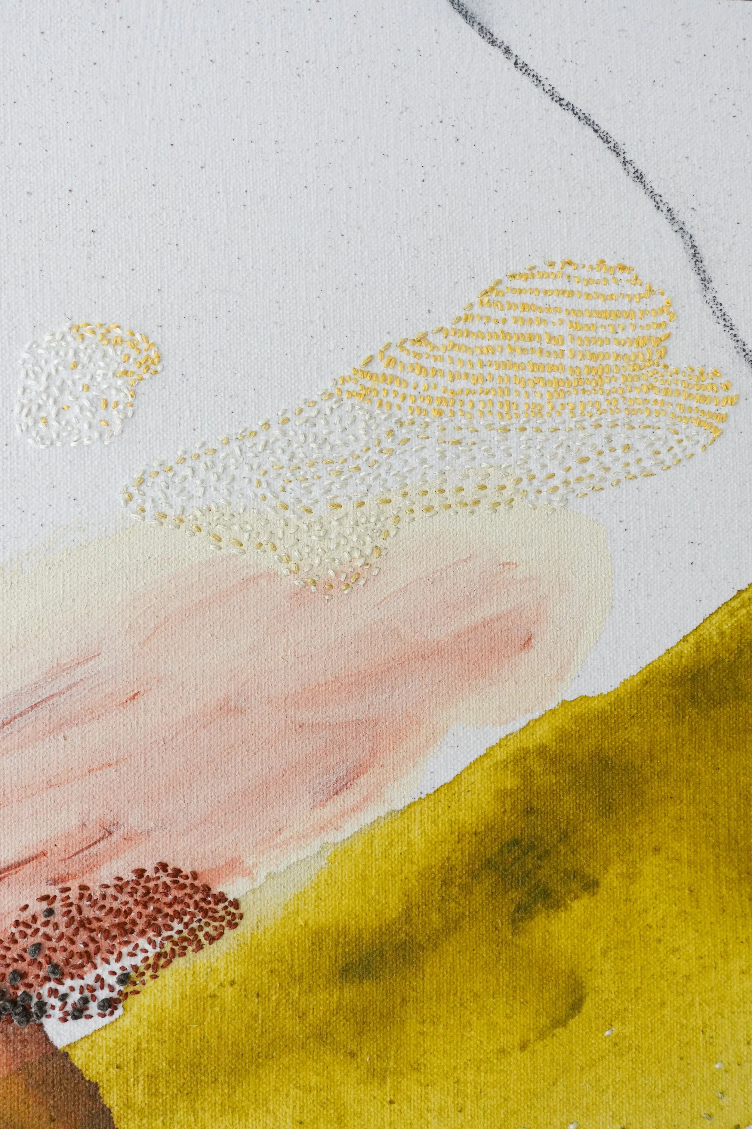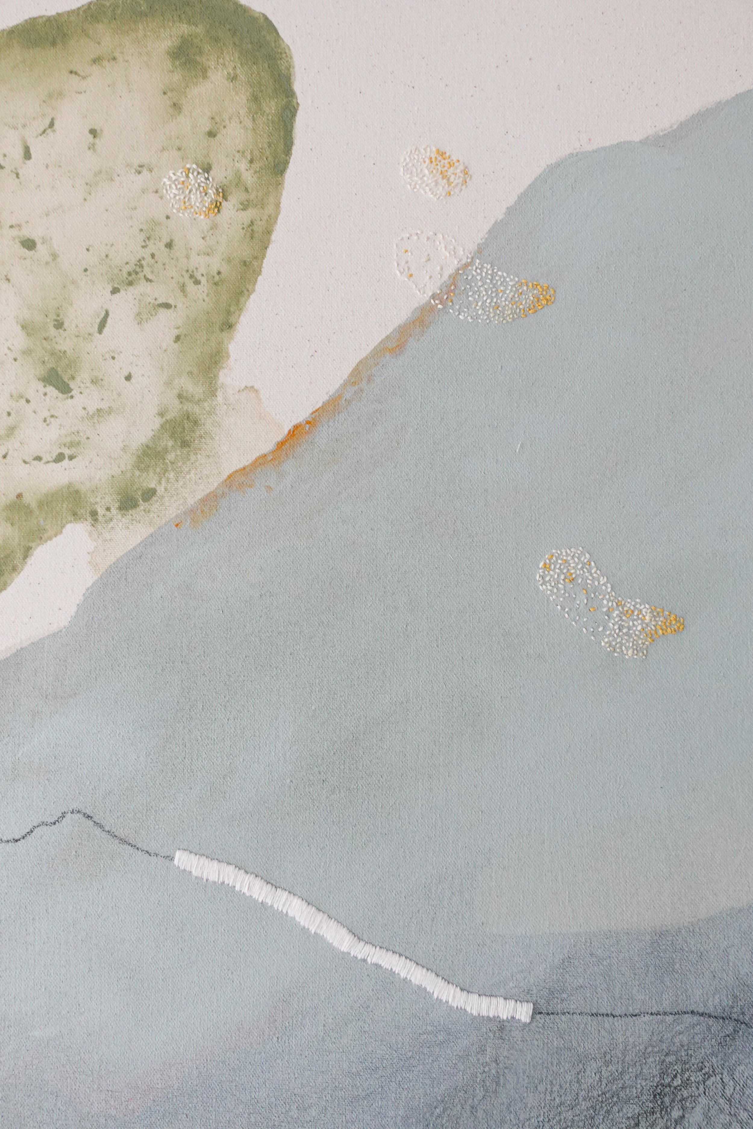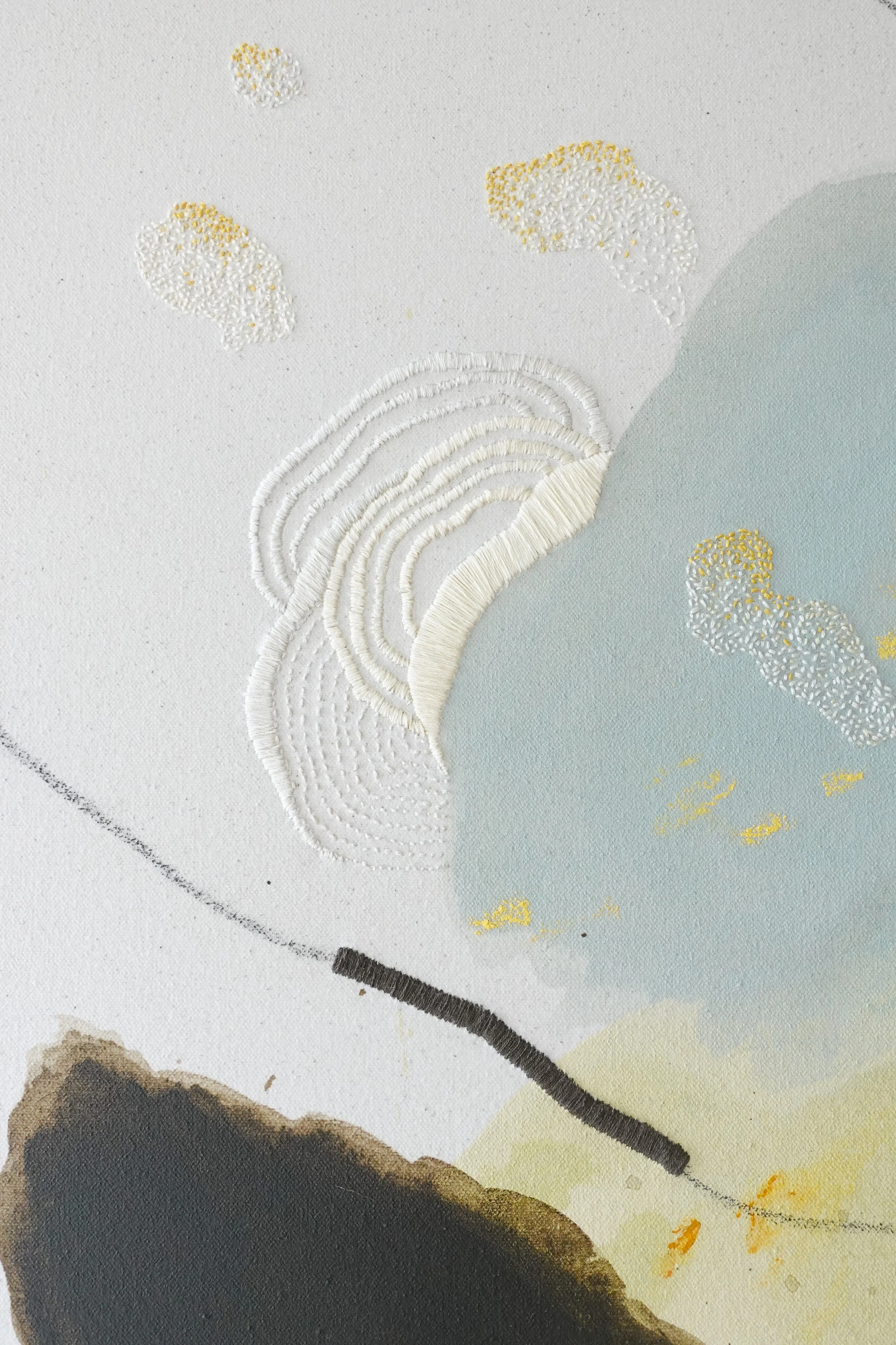Asami realized that it is essential to make the time to slow down and calm our minds, especially in the current age of information overload. She intends for the combination of her brushstrokes and embroidery in the “Cha no Ka” series to invoke the same sense of serenity and tranquillity that she felt while sipping on a cup of aromatic tea.