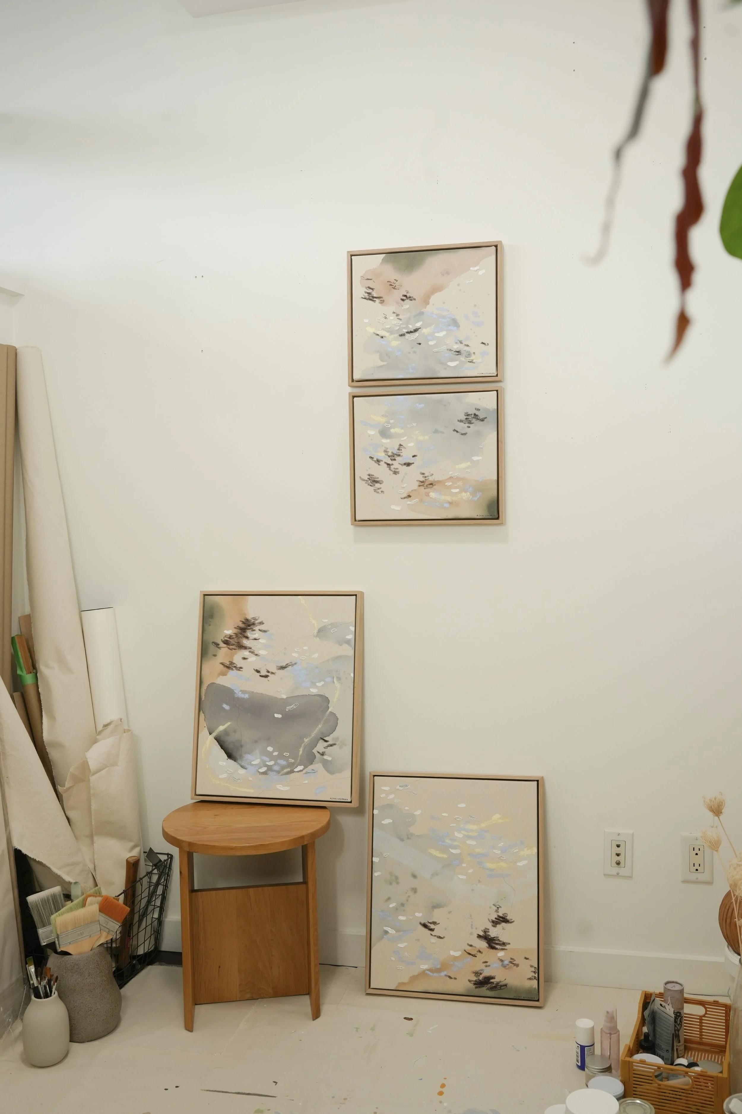 Acrylic paint, oil-based pigment sticks, graphite, charcoal, and fine embroidery threads in silk and cotton.
